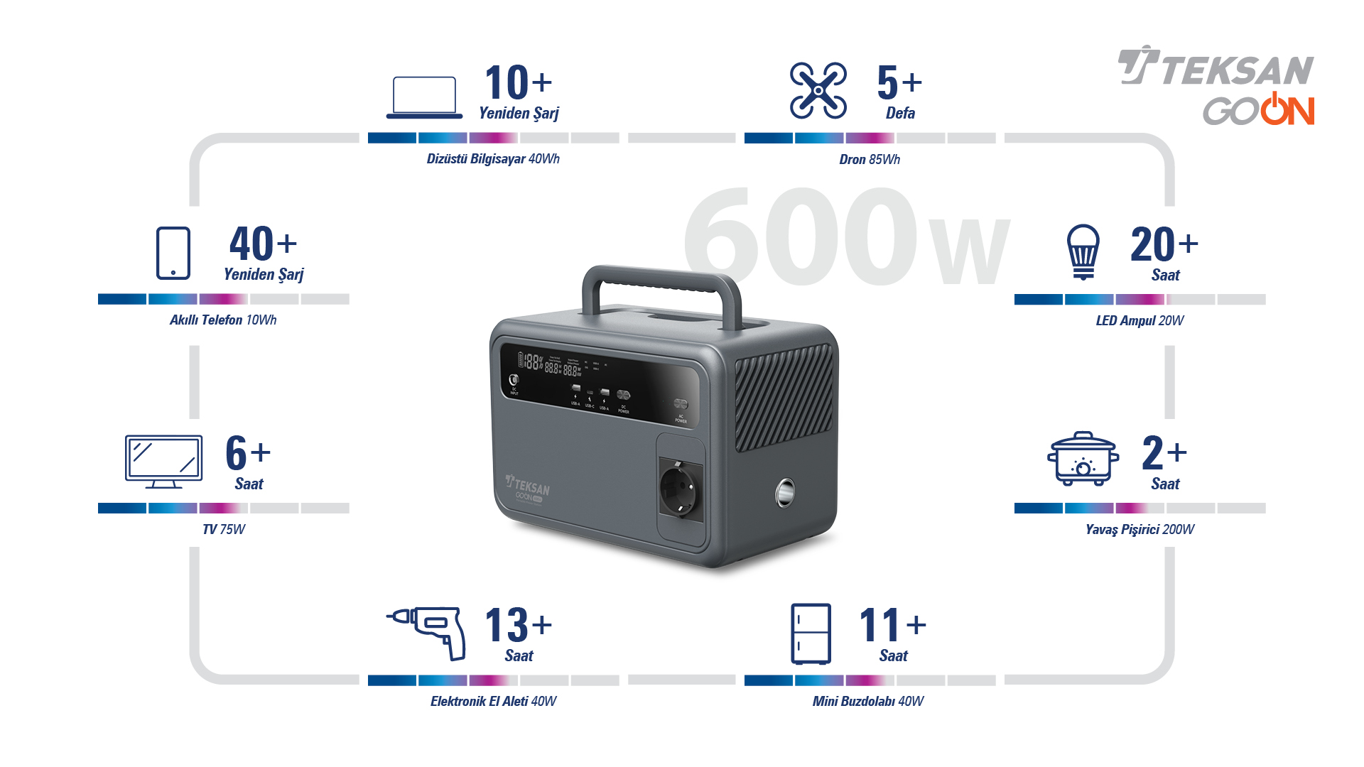 Kutu İçeriği:- 1x Teksan GO ON 600W Taşınabilir Güç İstasyonu, Güç Kaynağı